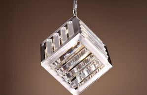 1 light chrome frame, K9 clear crystal cube pendant with matching chain. (Image with cold white bulbs). Bulbs are available in the Lamps section