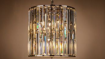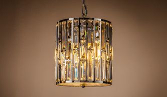 4 light polished nickel frame, K9 crystal drum pendant with matching chain. (Image with warm white bulbs). Bulbs are available in the Lamps section