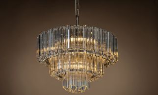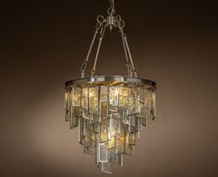 12 light polished nickel frame, ribbed pressed glass tubes on a tiered pendant. (Image with cold white bulbs). Bulbs are available in the Lamps section