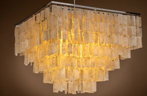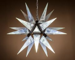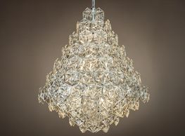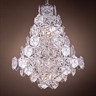 17 light polished nickel frame, faceted pressed glass pendant. (Image with warm white bulbs). Bulbs are available in the Lamps section