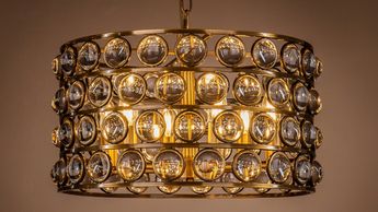 6 light polished nickel frame, K9 crystal drum pendant with matching chain. (Image with warm white bulbs). Bulbs are available in the Lamps section