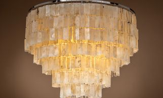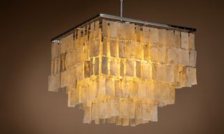 6 light, chrome finish frame, capiz shell pendant with matching chain. (Image with warm white bulbs). Bulbs are available in the Lamps section