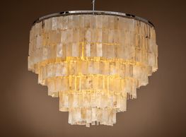 16 light polished nickel frame, ribbed pressed glass tubes on a tiered pendant. (Image with cold white bulbs). Bulbs are available in the Lamps section