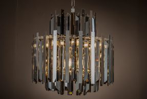 12 light polished nickel frame with added top frame, smoke crystal aspect curve pendant with matching chain. (Image with warm white bulbs). Bulbs are available in the Lamps section