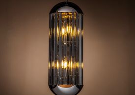 3 light polished nickel frame, smoke crystal aspect curve pendant with matching chain. (Image with warm white bulbs). Bulbs are available in the Lamps section